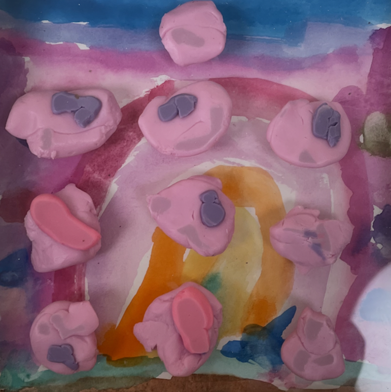 Students began by creating two separate art pieces: a watercolor-painted background to set the scene, and a clay element to serve as the focal subject. After completing both projects, the children brought their work together by assembling their own shadow boxes using affordable picture frames sourced from a discount store. This final step transformed their individual creations into a unified three-dimensional artwork. The workshop combined museum inspiration with hands-on creativity, helping kids build artistic confidence while learning about layering, composition, and mixed-media design. (Student Work 2023)